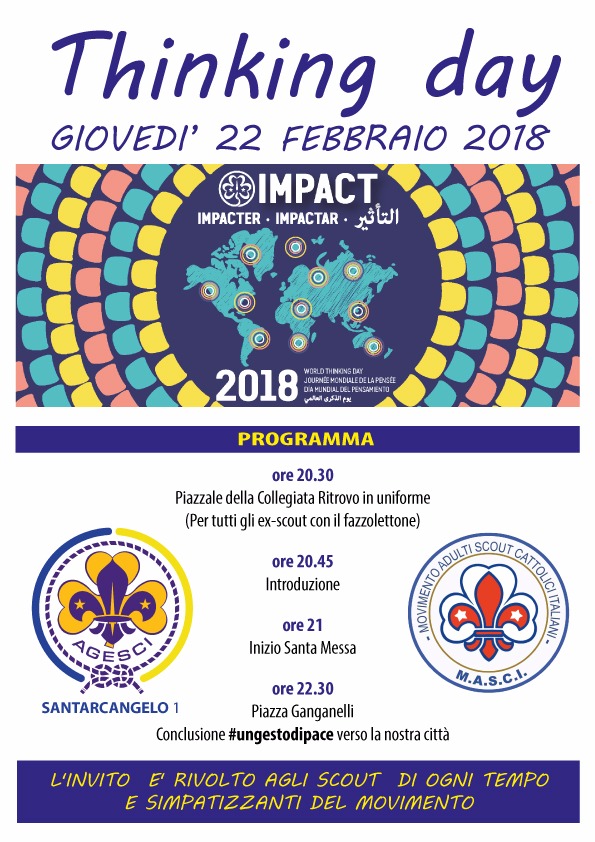 Il 22 febbraio – in occasione del compleanno dei fondatori dello Scautismo e del Guidismo, Sir Robert Baden-Powell e Lady Olave Baden-Powell – le Guide e Scout di tutto il mondo celebrano la Giornata del pensiero (Thinking day). E’ una opportunità di riflettere ed agire per rafforzare il Movimento scout e la fratellanza internazionale.