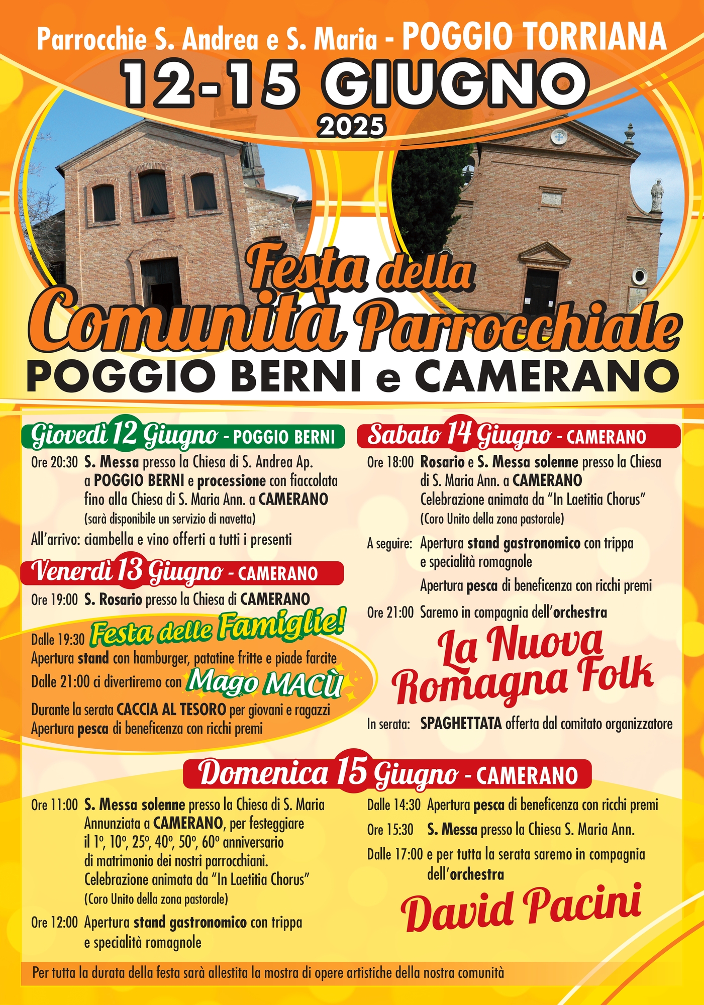 Dal 12 al 15 giugno 2025 torna la tradizionale Festa della Comunità Parrocchiale di Poggio Berni e Camerano, un appuntamento atteso da parrocchiani e fedeli per condividere momenti di fede, amicizia e allegria.