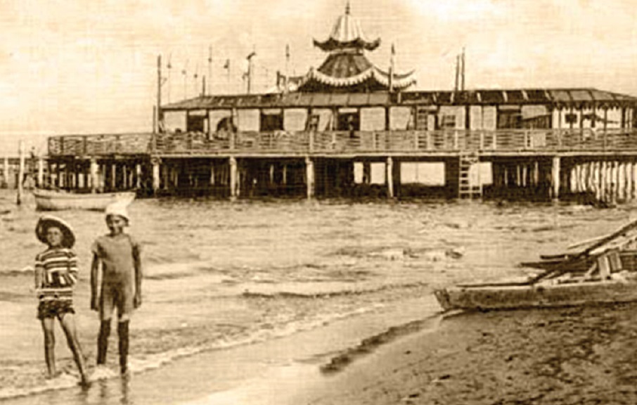 Semprini la pensa diversamente, persuaso che sì, “ci sarebbe ancora spazio per l’antica pagoda”. La piattaforma di legno realizzata a Rimini nel 1870, ispirata al gusto esotico del padiglione reale a Brighton, in Inghilterra, era una vera e propria isola dalla vita semestrale. Ogni anno, infatti, veniva “montata a maggio per essere poi smontata in autunno”<+testo_band>. Un’isola sul mare, al centro della quale, sotto un’elegantissima capanna a forma di chiosco (come una pagoda cinese racchiusa da un telone a righe multicolori) la borghesia del tempo trovava riposo, prima di scendere a farsi un bagno, passando dai camerini laterali, rigorosamente suddivisi fra maschi e femmine.