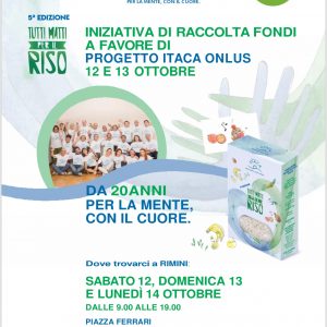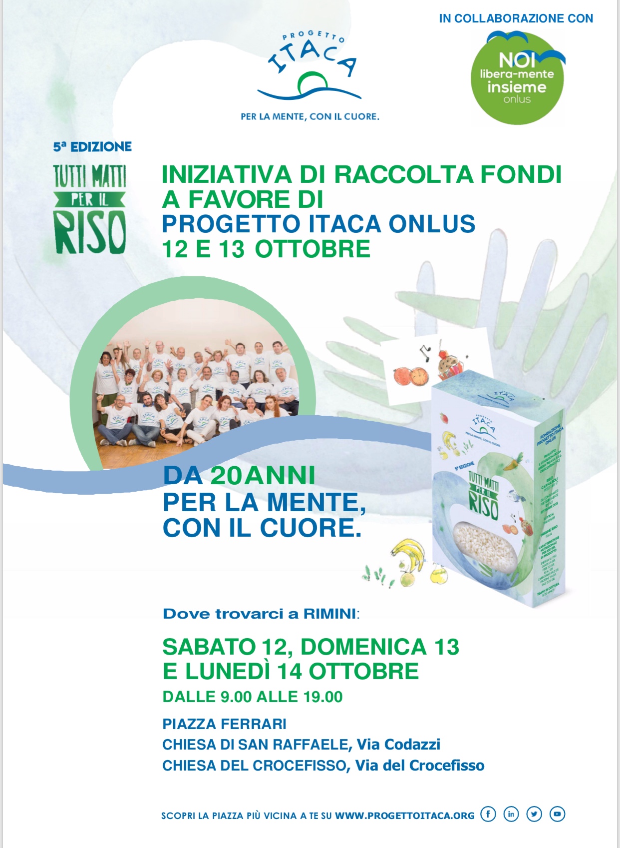 Per il secondo anno a Rimini, i volontari e i soci dell’Associazione “Noi liberamente insieme” Progetto Itaca Rimini Odv, il 12, il 13 e 14 ottobre ( in concomitanza con San Gaudenzo) saranno in piazza Ferrari ( vicino Domus del Chirurgo) e in alcune parrocchie della città ( Chiesa di San Raffaele Arcangelo, Via Codazzi e Chiesa del Crocefisso, Via del Crocefisso), in occasione della Giornata Mondiale della Salute Mentale indetta dall’OMS del 10 ottobre, per divulgare l’evento nazionale “Tutti matti per il riso” raccolta fondi a sostegno della sede di Rimini di Via Graf, 14 e dei progetti.