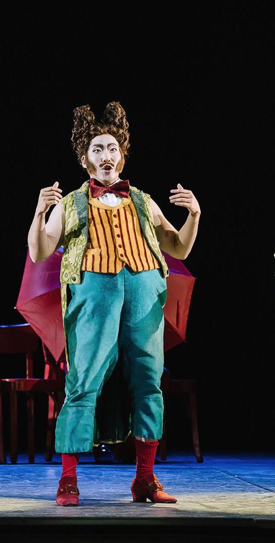 Su tutti svettava il protagonista, il baritono coreano Hae Kang, un Figaro non solo disinvolto e versatile in scena, ma dotato di buoni mezzi vocali e capace di fletterli alle esigenze della scrittura rossiniana, anche grazie alla buona dizione. Il personaggio del Conte di Almaviva – quando Il barbiere debuttò a Roma nel 1816 – era stato concepito per Manuel García, uno tra i massimi divi dell’epoca: in quei panni Pietro Adaini ha purtroppo evidenziato un volume vocale esiguo, con cui non sempre è riuscito a sostenere i suoni, né ha avuto quella facilità in acuto dei tenori di grazia cui oggi di solito viene affidato il personaggio (ha anche eliminato l’ultima aria in un’edizione sostanzialmente senza tagli). Aleksandra Meteleva è stata una Rosina con buona presenza di spirito; e se la voce appariva un po’ sorda, soprattutto nella regione grave, si poteva lodare la sicurezza del mezzosoprano russo nelle colorature. Nella parte di don Bartolo, il buffo Giuseppe Toia ha affrontato A un dottor della mia sorte – compreso il vorticoso sillabato – cercando saggiamente di puntare soprattutto sull’accento. Il personaggio negativo di don Basilio, che la regia dipinge (nel senso letterale del termine, perché anche il volto è colorato di verde) come un rettile provvisto di coda, era il basso Eugenio Di Lieto, dall’emissione omogenea e dal fraseggio compenetrato. Interpretava Berta la corretta Melissa D’Ottavi: vestita da vera cameriera, in abito nero e grembiulino bianco, efficace nella sua aria e sonora – più di Rosina – nel ‘finale primo’. Infine il baritono Davide Chiodo, indossando un impermeabile giallo abbagliante, ha ricoperto con sicurezza il piccolo ruolo di Fiorello.
