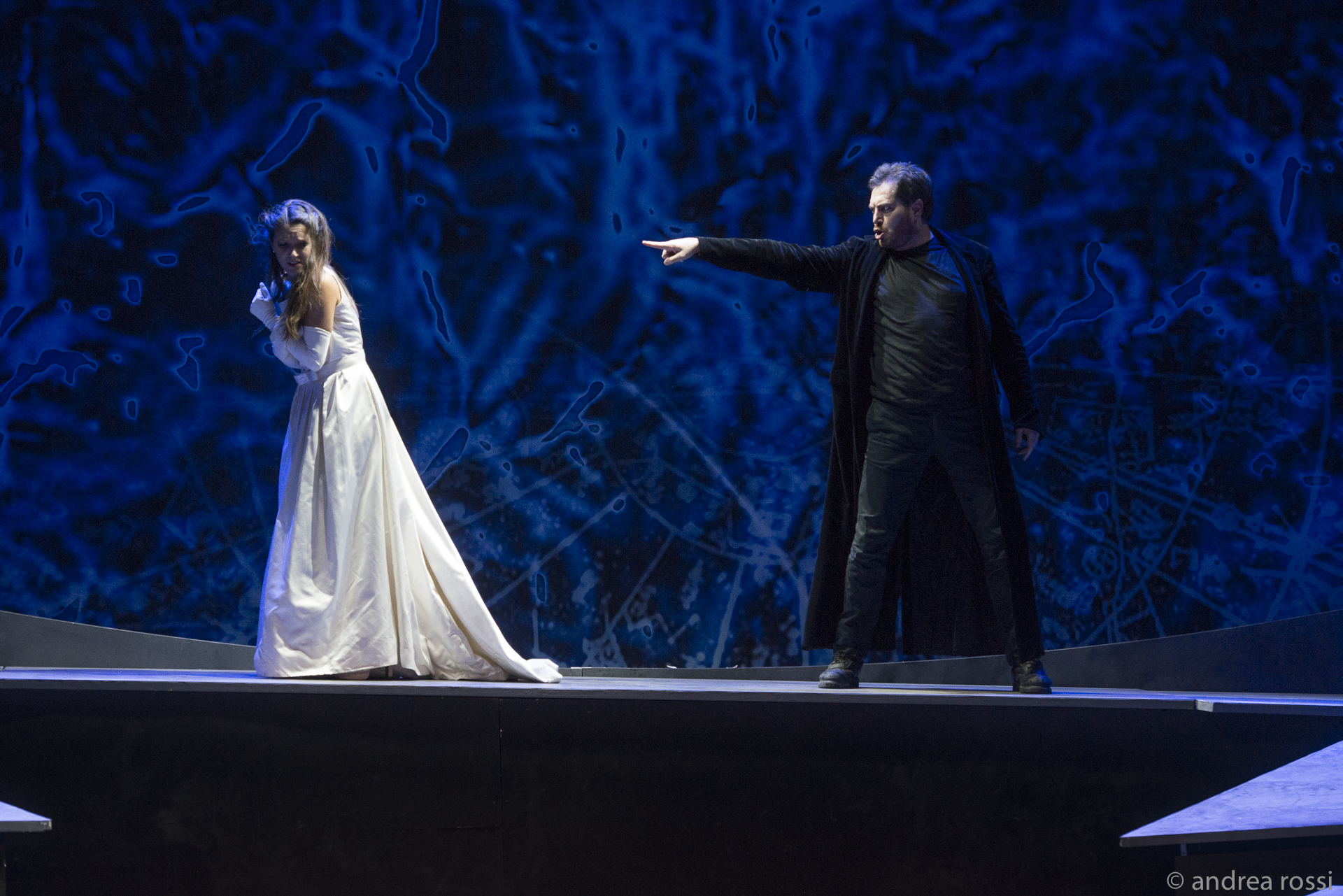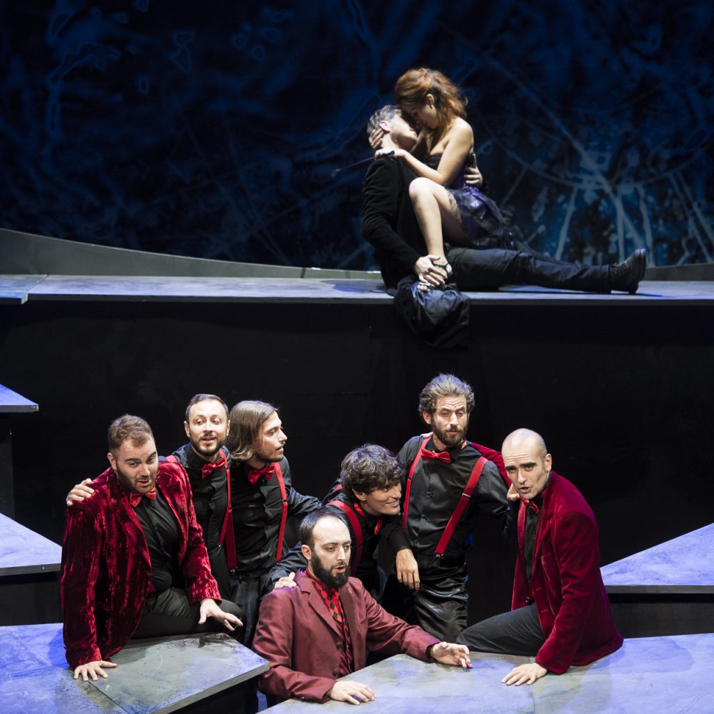 Alessandro Quarta ha guidato il Reate Festival Baroque Ensemble – un gruppo di tredici strumentisti – con apprezzabili intenti stilistici, ottenendo sonorità sempre fluide e riuscendo a valorizzare la varietà musicale dell’opera. Anche l’affiatata compagnia di canto, formata da giovani, si è mostrata all’altezza, a cominciare da Mauro Borgioni, che disegna un protagonista baldanzoso e accattivante: la scelta di affidare a un baritono un ruolo scritto per castrato forse è discutibile sul piano filologico, ma certo consente una migliore verosimiglianza in palcoscenico. Accanto a lui un altro baritono, Giacomo Nanni, era l’agile e scattante servo Bibi, antenato di Leporello, che però – a differenza dell’omologo mozartiano – qui emula il padrone, intessendo una liaison con l’attempata nutrice Delfa: ruolo per tenore en travesti, secondo le consuetudini dell’epoca, ricoperto dallo spiritoso Alessio Tosi. Parente prossima di Donna Anna è Ipomene, la solida Michela Guarrera, mentre il suo amato, il querulo Cloridoro (precursore di Don Ottavio), ancora un ruolo en travesti, era affidato a una credibile Carlotta Colombo. Sono numerose le analogie fra Donna Elvira e Atamira, anche in questo caso sposa abbandonata del protagonista (il regista fa indossare all’interprete Sabrina Cortese sempre l’abito nuziale), ma a differenza del personaggio mozartiano – destinato a ritirarsi in convento – alla fine Atamira accetta la mano del Re di Macedonia (il nobile ed espressivo Alessandro Ravasio). Nell’Empio punito non poteva poi mancare l’invito a cena. Qui, però, il convitato ucciso dal protagonista – delitto che lo condurrà all’inferno – non è il padre, ma l’aio di Ipomene (interpretato da Riccardo Pisani). Ci sono ancora altri personaggi minori, mentre mancano Zerlina e Masetto. D’altra parte la coppia Da Ponte e Mozart introduce alcune varianti: poche, ma sufficienti a realizzare un capolavoro ineguagliabile.