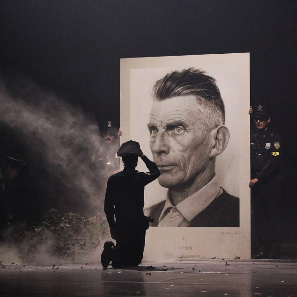 A scandire una sorta di drammaturgia dei comportamenti vengono esibite gigantesche fotografie: tra queste, il ritratto di Samuel Beckett riconduce alla dimensione teatrale, che si riaffaccia nel finale. Dall’alto cala un tendaggio arrotolato e con semplici gesti – forse l’immagine più bella dell’intero spettacolo – si trasforma in un sipario su cui campeggia la scritta De pullo et ovo (del pulcino e dell’uovo). Dietro, s’intravedono le gambe di un bambino: viene vestito di bianco, qualcuno gli consegna un manganello, che lui impugna prima di sparire, inghiottito dal gruppo. L’immagine non lascia troppe speranze, anche se la candida veste richiama quella dell’inascoltato profeta. E indirettamente la funzione stessa del teatro.