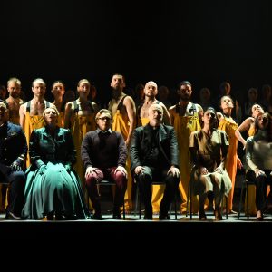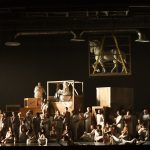 Il sipario si apre su una nave dove una folla di prigionieri viene trattata brutalmente da militari a volto coperto, che li schedano ad uno ad uno (come non pensare ai tanti profughi di oggi?). Un piccolo schermo mostra odierne, o futuribili, immagini di guerra e distruzioni: sono le macerie di una città – forse Kobane o Raqqa – a ricordarci che poco è cambiato rispetto all’epoca dei conflitti fra assiri ed ebrei e, allo stesso tempo, potrebbero riguardare il nostro immediato futuro. Nabucco, capitano della nave, e Abigaille che gli subentrerà, sono d’altronde due tiranni molto simili a tanti politici di oggi.
