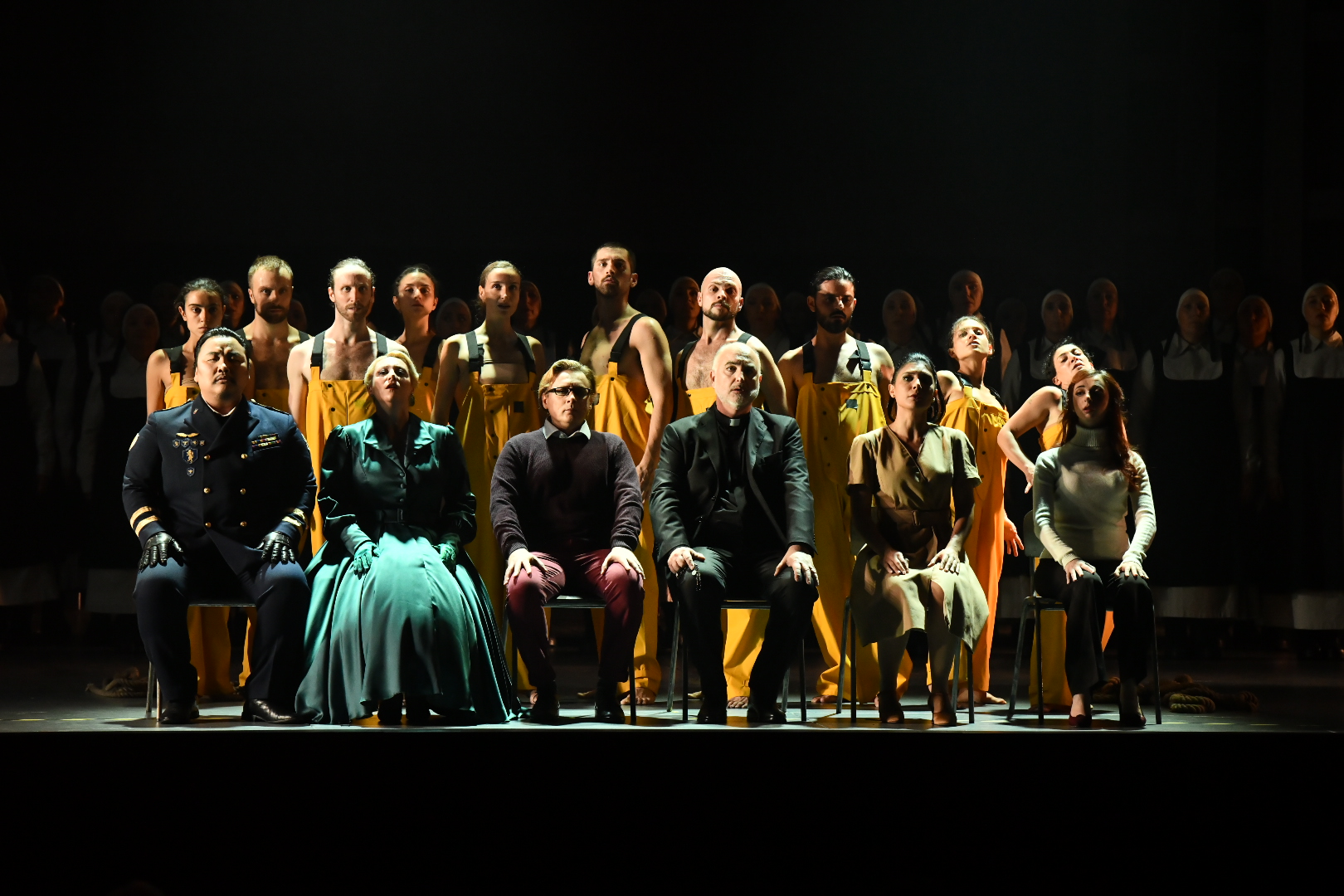 Il sipario si apre su una nave dove una folla di prigionieri viene trattata brutalmente da militari a volto coperto, che li schedano ad uno ad uno (come non pensare ai tanti profughi di oggi?). Un piccolo schermo mostra odierne, o futuribili, immagini di guerra e distruzioni: sono le macerie di una città – forse Kobane o Raqqa – a ricordarci che poco è cambiato rispetto all’epoca dei conflitti fra assiri ed ebrei e, allo stesso tempo, potrebbero riguardare il nostro immediato futuro. Nabucco, capitano della nave, e Abigaille che gli subentrerà, sono d’altronde due tiranni molto simili a tanti politici di oggi.