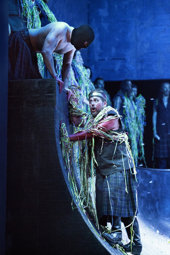 Notevole il lavoro fatto da Thalheimer sui cantanti, tutti trasformati in ottimi attori. A cominciare dal baritono Craig Colclough, capace di scolpire un protagonista di grande carica espressiva: voce non troppo tonda e nell’insieme avara di legato, ma accenti sempre incisivi, in grado di dare la percezione dell’inarrestabile discesa di Macbeth lungo la china del male. Accanto a lui, ottima interprete anche Katia Pellegrino (chissà per quali ragioni la cantante pugliese non lavora più in Italia?): è impressionante come dà avvio al brindisi battendo i piedi al suolo. Le sue caratteristiche da soprano lirico non sembrerebbero ideali per Lady Macbeth: sfodera, invece, un’insospettata temperatura drammatica grazie a una notevole sicurezza nel registro superiore e, al contempo, alla capacità di trasformare le discese al grave quasi in uno Sprechgesang dai colori spettrali. Infine s’impone il Banco di Tareq Nazm, per i grandi mezzi d’una voce di basso sempre ben timbrata, che nel duetto con Macbeth riesce ad assumere un peso da autentico deuteragonista. All’altezza dei ruoli sia il tenore Najmiddin Mavlyanov (Macduff), che nella sua aria Ah! La paterna mano ha mostrato solidità e adesione alle indicazioni della scrittura verdiana, sia il secondo tenore Michael J. Scott (Malcom) in grado di non sfigurare nel duetto con il collega. E se un po’ incolore è invece apparso Donald Thomson in veste di medico, apprezzabile Chia-Fen Wu come dama di Lady Macbeth: testimoni esterrefatti al suo spegnimento.
