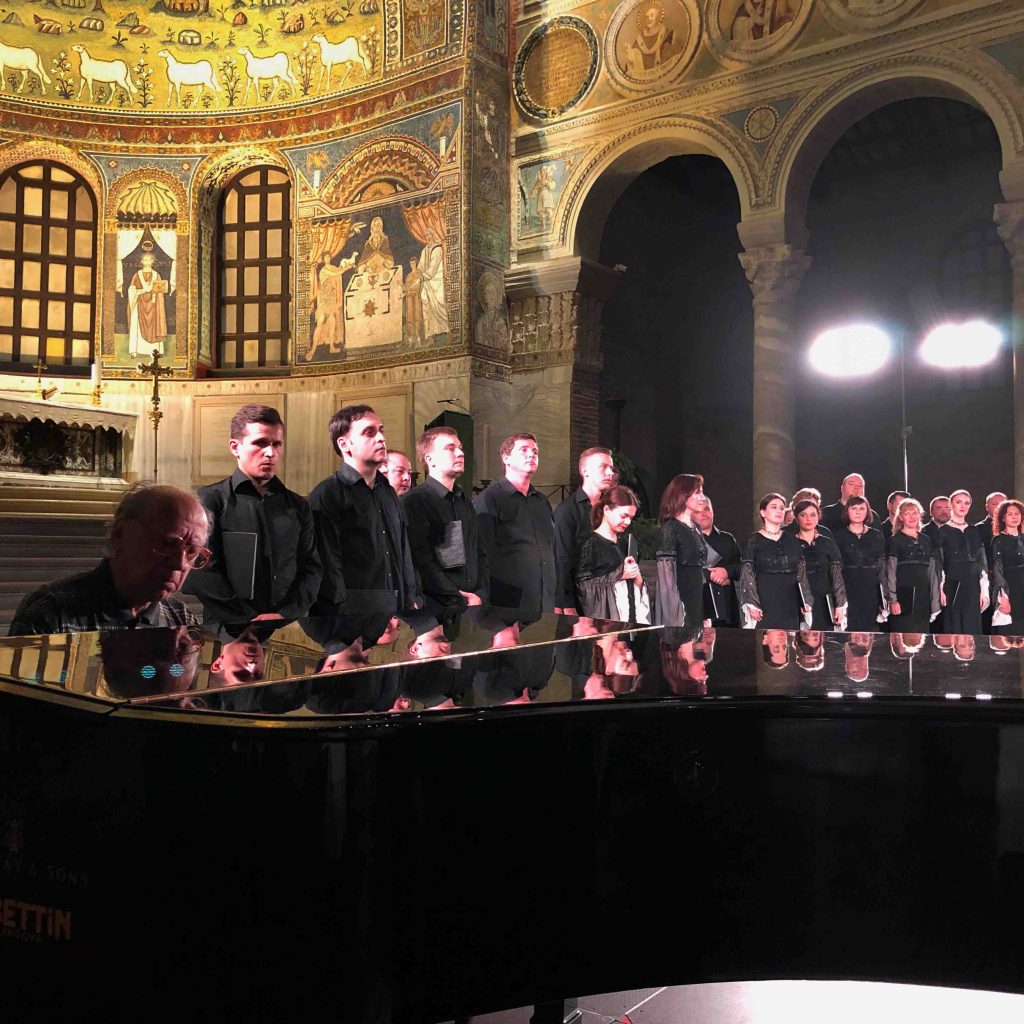 Nel secondo concerto, a Sant’Apollinare in Classe, si sono esibiti l’Orchestra e il Coro dell’Opera Nazionale “Taras Shevchenko” (il più importante teatro ucraino) sotto la guida di Mykola Diadiura, che ne è anche il direttore principale. In programma la recente Elegia e pastorale per pianoforte e orchestra d’archi – in prima esecuzione italiana – che ha visto impegnata come solista un’impeccabile Anastasiya Titovych e la Cantata n. 4 per soprano, pianoforte e orchestra d’archi, affidata all’espressivo soprano Kseniya Bakhritdinova-Kravchuk, dal seducente timbro venato di ombreggiature scure: due brani dove il ruolo solistico, sia esso pianoforte o voce, è estraneo a ogni virtuosismo, mantenendo rispetto agli altri strumenti sempre una funzione di primus inter pares. La stessa idea sonora si rintracciava nella seconda parte della serata, quando si è esibito il magnifico coro guidato dal giovane Bogdan Plish, dove i numerosi interventi solistici erano affidati a bravissimi componenti: nei Canti liturgici (2005) le minuziose indicazioni dinamiche del compositore sono state splendidamente valorizzate da un’esecuzione emozionante per la bellezza e l’avvolgente magia sprigionata dai lunghi suoni tenuti, e che l’acustica della Basilica sembrava ulteriormente potenziare.