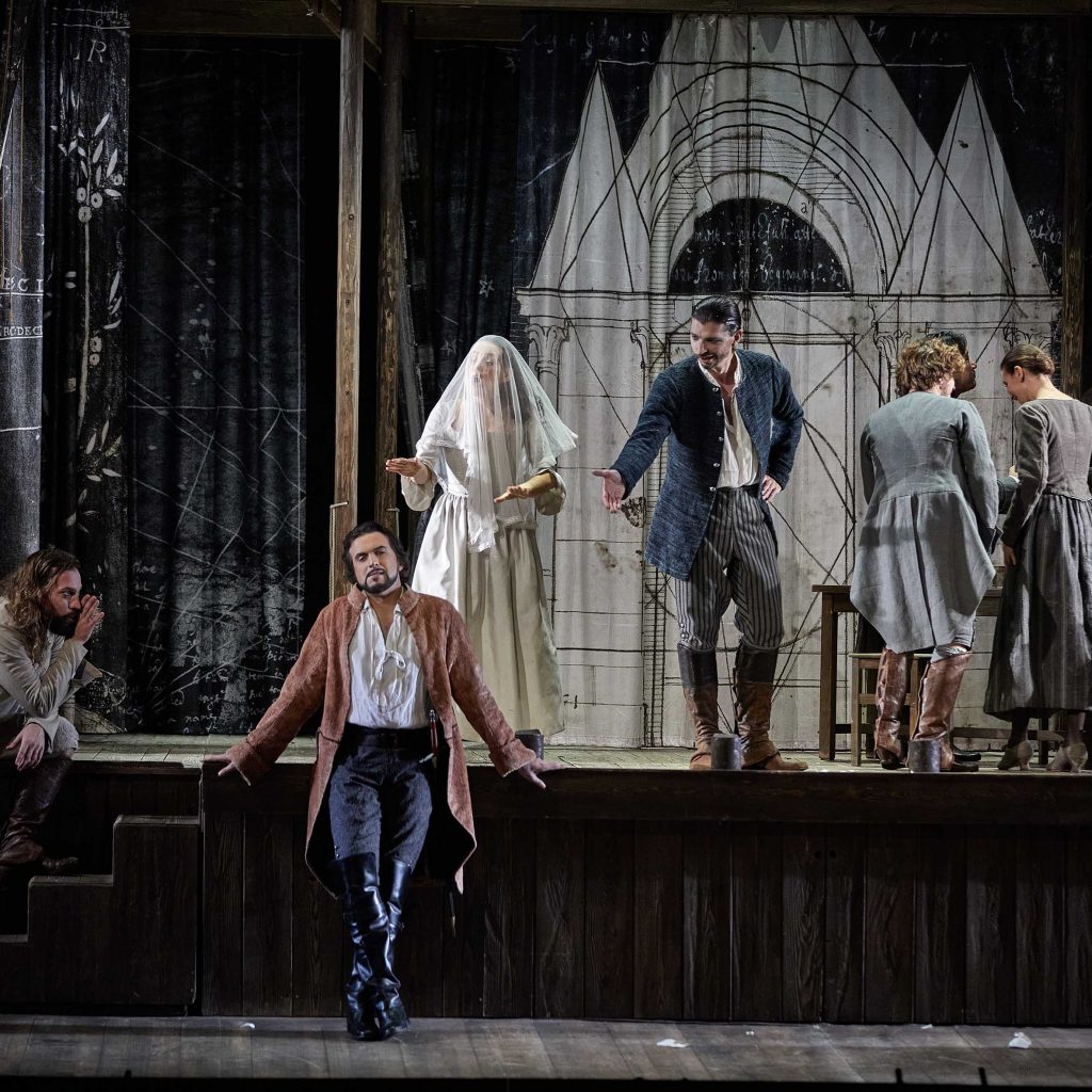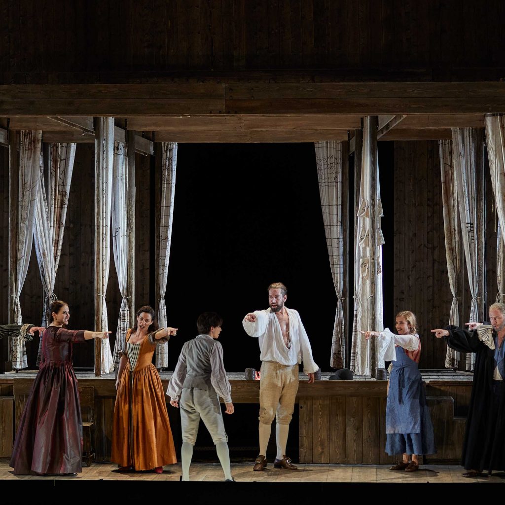 Frutto di una coproduzione internazionale che coinvolge anche Francia e Spagna, i tre spettacoli sono nati per il piccolo teatro di corte di Drottningholm, in Svezia, e portano la firma del regista Ivan Alexandre, mentre Antoine Fontaine è autore della versatile e semplicissima scatola scenica, unica per tutte le opere: i vari ambienti sono disegnati da tende, ogni volta dipinte in modo diverso, che funzionano come quinte mobili. Prima che cominci la musica, la regia colloca già gli interpreti al proscenio, dove completano la loro vestizione (i costumi minimalisti d’ispirazione settecentesca sono dello stesso scenografo) sotto lo sguardo del pubblico; ed è una scelta che, abbattendo il muro di separazione tra palco e platea, si rivela felice per vicende legate a un immaginario condiviso, anzi ormai archetipico.