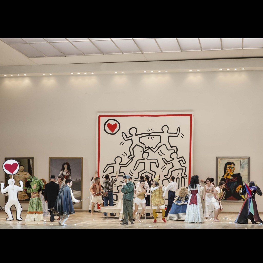 ROMA, 16 giugno 2017 – Un’istantanea d’epoca: il quadro di François Gérard del 1827 realizzato per L’incoronazione di Carlo X, avvenuta due anni prima, che si compone un po’ alla volta nel corso dello spettacolo. È questa la chiave di lettura adottata da Damiano Michieletto nel suo Viaggio a Reims: un allestimento nato ad Amsterdam due anni fa e adesso in calendario all’Opera di Roma (scene di Paolo Fantin e costumi di Carla Teti). In luogo della locanda del Giglio d’Oro nella località termale di Plombières, immaginata dal libretto, il regista ambienta la monumentale cantata scenica – composta da Rossini nel 1825 per festeggiare l’incoronazione del sovrano francese – in una galleria d’arte: location tra le più di moda, da qualche anno a questa parte, per le regie d’opera. Così il bizzarro campionario di personaggi provenienti da tutta Europa per partecipare ai solenni festeggiamenti, ideato da Luigi Balocchi (un librettista che non finisce di sorprendere per la capacità di alternare ricercati contenuti di respiro internazionale a versi spiritosamente dozzinali), prende lentamente forma accanto ai più iconici capolavori di varia nazionalità: Velasquez, Goya, Picasso, van Gogh, Botero, Magritte, Frida Kahlo e persino Keith Haring. Ma la trovata forse più suggestiva, fra le animazioni delle opere esposte nella galleria, sono le tre Grazie che – per dar vita a un’armoniosa danza – escono dalla teca in cui sono racchiuse e poi vi rientrano. Naturalmente, in tale rivisitazione drammaturgica non rientrano tutti i personaggi: ne rimane esclusa l’albergatrice Madama Cortese, che qui si trasforma in una esagitata gallerista; la sua tuttofare Maddalena; il collezionista di anticaglie Don Profondo, divenuto un battitore d’asta; e la poetessa classica Corinna, raffigurata come una ragazzetta secchiona che si aggira per le stanze del museo.