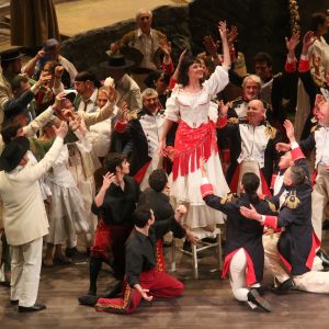 Il consueto appuntamento d’inizio anno, organizzato dal Coro Lirico Amintore Galli, si è tenuto così finalmente in una sede adatta, capace di valorizzare anche il funzionale spettacolo del regista Paolo Panizza (con le scene di Franco Armieri e i colorati costumi spagnoleggianti di Mirella Ranzani): didascalico al punto giusto – tanto più che il pubblico di Rimini sarebbe rimasto disorientato di fronte a letture poco tradizionali – e, soprattutto, rispettoso della musica, oltre che piacevole a vedersi. Carmen del resto è un’opera su cui non è necessario intervenire troppo, dato che funziona benissimo in palcoscenico: il ritratto della protagonista, così come emerge dal libretto tratto dalla novella di Mérimée e pennellato dalla musica di Bizet, ha un significato premonitore di una realtà – quella del femminicidio – che è emersa in maniera drammatica proprio negli ultimi anni. Fanno un po’ sorridere, però, certi finali modificati di oggi, nel tentativo di renderli politically correct, perché tolgono forza all’originale ed è abbastanza improbabile che possano agire da deterrenti nei confronti delle uccisioni di tante donne. Nell’opera di Bizet la bella sigaraia finirà accoltellata da don José, che non tollera di averla perduta, ma Carmen va incontro in modo del tutto consapevole al suo destino (nello spettacolo di Panizza ce lo ricordano i giganteschi tarocchi che vengono innalzati a ogni finale d’atto): sa benissimo che questo è il prezzo da pagare per la scelta di libertà che ha fatto.