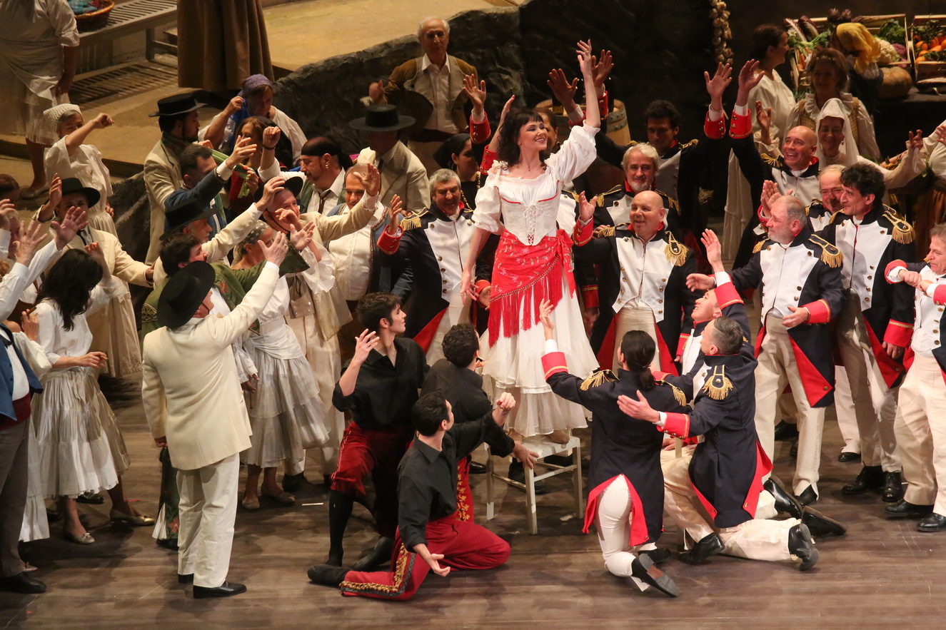 Nel ruolo di protagonista, la russa Anastasia Boldyreva ha sfoggiato un bel colore mezzosopranile: il canto, però, non trasmette grande sensualità – la voce è un po’ aspra – e la sua Carmen è più ribelle che seduttiva. Accanto a lei il tenore Giuseppe Varano è apparso ben calato nei panni di Don José, riuscendo a rendere del tutto credibile, anche sul piano vocale, il suo personaggio: un uomo sostanzialmente debole che si trasforma in cieco omicida. Affidabile professionista il soprano Paola Cigna, una Micaëla precisa ed espressiva nel trasmettere il suo spaesamento di fanciulla perbene quando si rende conto che non può competere con la rivale. Un po’ sottodimensionato per volume il corretto Escamillo di Daniele Caputo. Al di là del quartetto protagonistico, bisogna poi ricordare almeno Elisa Luzi e l’apprezzabile Giada Frasconi, rispettivamente Frasquita e Mércèdes, le amiche della protagonista, oltre al baritono Giovanni Mazzei e al tenore Roberto Carli, ossia Dancairo e Remendado: i contrabbandieri che assumono un peso significativo nel quintetto del secondo atto. Solido e autorevole nei panni militari di Zuniga il basso Luca Gallo.
