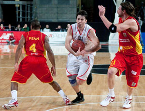 Nella foto, Demian Filloy “buca” la difesa di Scoonie Penn e Ivan Gatto (foto Gallini)