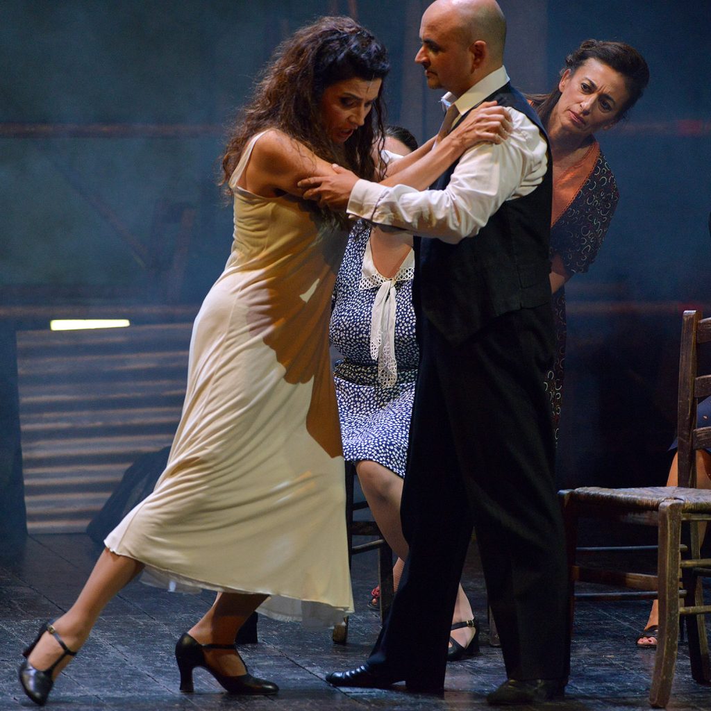 Solo tre i personaggi. Nel ruolo che fu di Milva, il mezzosoprano Giuseppina Piunti ha saputo trasmettere l’innocenza della protagonista attraverso una notevole fisicità. Il suo calore umano e la sensualità vengono esaltati anche dal confronto ravvicinato con il personaggio del giovane scrittore (El Playador), reso da un baritono – come Enrico Maria Marabelli – tetragono e algido. Al contrario, un passionale folletto (El Duende) è stato Davide Mancini, voce recitante, nel ruolo di narratore e burattinaio della vicenda. Attorno a loro si muoveva un mondo di reietti, interpreto da tangueri professionisti che ballano secondo le coreografie di Andrea Degani e Giovanna Di Fazi.
