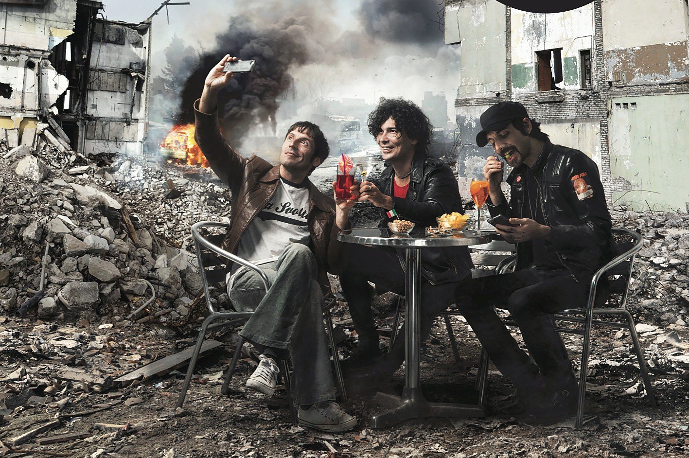 Facendo però un piccolo passo indietro, già dalla copertina dell’album si intuisce che qualcosa di differente dai temi degli album precedenti prenderà corpo e si svilupperà lungo le dieci tracce concludendosi con i dieci minuti (e ventisette secondi) finali di Andrà tutto bene, dove la musica e le parole lasciano spazio a sonorità che svaniscono, come quasi a morire. Nella copertina, dicevamo, ci sono loro tre, Andrea Appino, Karim Qqru, e Ufo (Massimiliano Schiavelli), seduti al tavolino in pieno Happy Hour con aperitivi, stuzzichini e l’immancabile selfi. Una bella immagine, se non fosse che alle loro spalle il mondo è devastato dalla terza guerra mondiale. Il mondo non esiste più è chiaramente la metafora della nostra realtà, quel mondo fatto di relazioni filtrate dalla rete, discussioni barricandosi dietro ad una tastiera, un mondo di apparenza che non lascia scampo. E se tutto è visto con una chiave più rock del solito, tralasciando quindi un pochino quel folk “da combattimento” che li ha resi celebri, c’è una melodia finale che accompagna al silenzio, quel silenzio che viene dopo il fragore di una guerra appena finita di combattere.